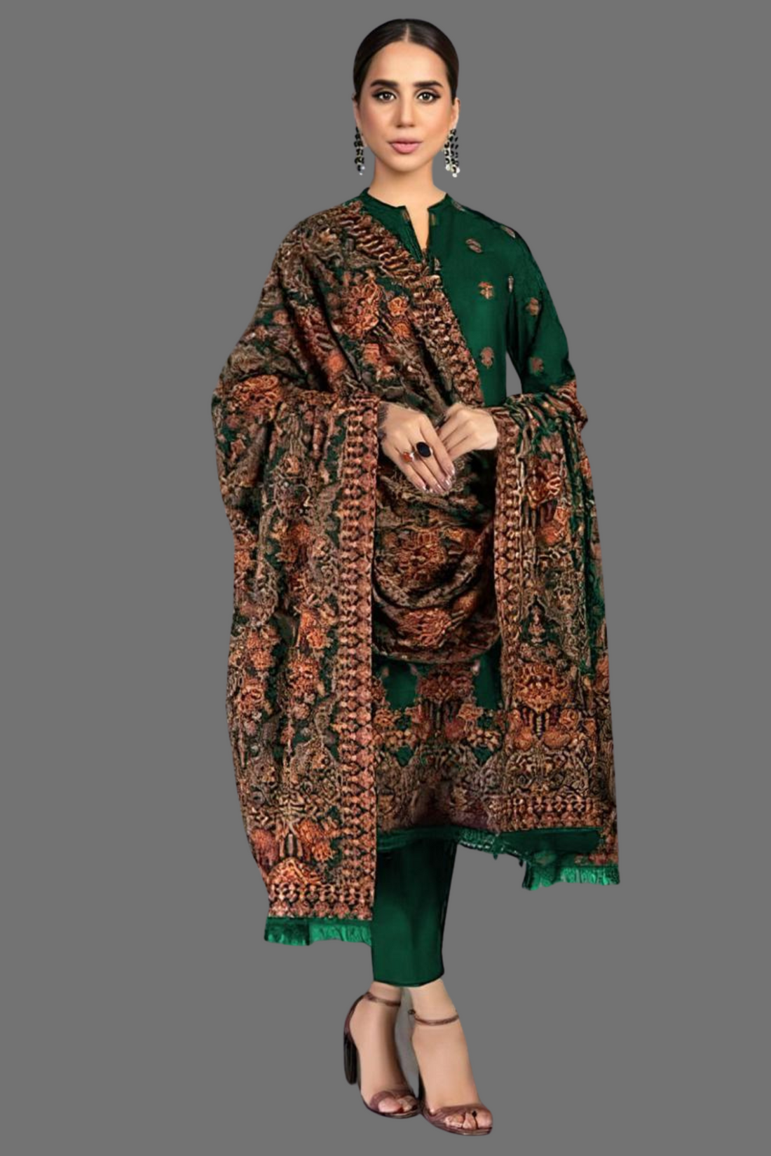 Luxury Embroidered 3pcSTUFF: Best Quality Air jet Dhanak Fabric ✔ Front Full Heavy Multi-Head Embroidered...