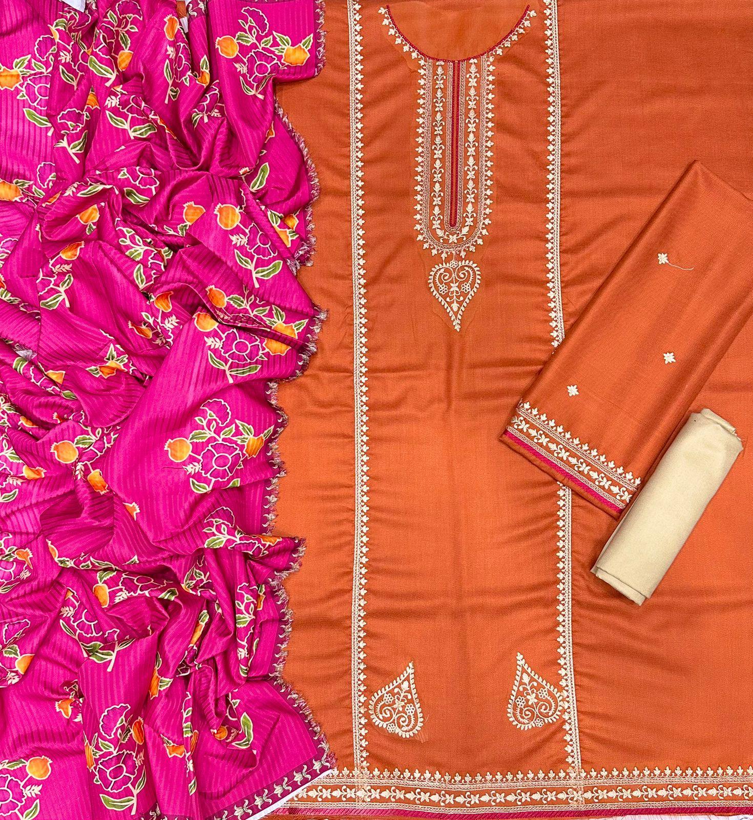 Indulge in the delicate embrace of Pashm – a luxury 3-piece ensemble that blends the richness of traditional embroidery with the cozy elegance of a digital print Kotrai woolen shawl. Crafted from Best Export Quality Airjet Dhanak Fabric, this set is designed for those who seek comfort without compromising on sophistication. Perfect for cool evenings and grand celebrations alike.