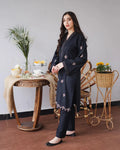 3pc Black straight kurta in premium linen with ethnic embroidered motif and border on front along with sleeves. (decorated with patterns of thread) repeating idea and border on front along with sleeves.